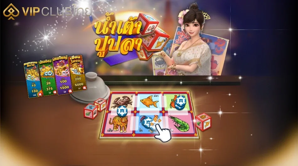 - อุปกรณ์การเล่น: เกมนี้เป็นเกมพื้นบ้านยอดนิยมของไทยที่ใช้ลูกเต๋า 3 ลูก โดยแต่ละหน้าของลูกเต๋าจะเป็นสัญลักษณ์รูปภาพที่แตกต่างกันทั้งหมด 6 แบบ ได้แก่ น้ำเต้า, ปู, ปลา, เสือ, ไก่ และกุ้ง