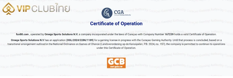 FUN88 คือสุดยอดเว็บคาสิโนออนไลน์ที่ให้บริการแบบเว็บตรง ไม่ผ่านเอเย่นต์ ทำให้คุณมั่นใจในความปลอดภัยและความน่าเชื่อถือได้อย่างเต็มที่ เพราะบริหารงานและได้รับใบอนุญาตอย่างถูกต้องจาก Curacao Gaming Control Board นอกจากนี้ ซอฟต์แวร์ของเว็บยังผ่านการตรวจสอบและรับรองโดย iovation เพื่อให้คุณวางใจได้ในทุกการเดิมพัน