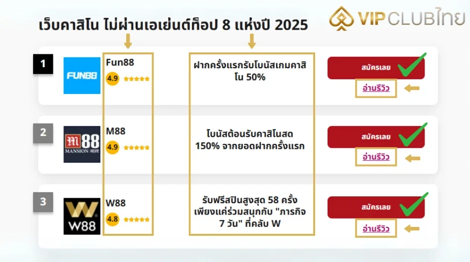 มองหาเว็บคาสิโนที่ไม่ผ่านเอเย่นต์อยู่ใช่ไหม คู่มือนี้จะช่วยคุณค้นหาเว็บตรงที่ดีที่สุดและปลอดภัยที่สุดในประเทศไทย เพราะการเล่นกับเว็บตรงนั้นทำให้คุณมั่นใจได้ว่าการทำธุรกรรมจะสะดวกทุกยอด ไม่มีสะดุด และคุณจะได้เล่นเกมจากผู้ให้บริการที่น่าเชื่อถือโดยตรง ตรวจสอบรายชื่อเว็บตรงที่เราคัดสรรมาให้คุณแล้วด้านล่างนี้ เพื่อเริ่มประสบการณ์การเล่นเกมคาสิโนที่ปลอดภัยและดีที่สุดได้เลย